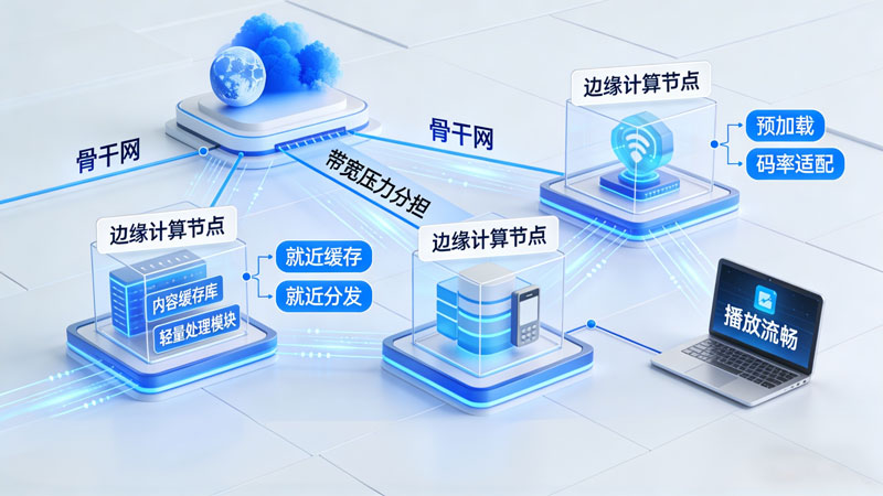 在视频点播场景中,边缘计算节点部署在靠近用户的网络边缘,实现内容就近缓存、就近分发,大幅降低传输延迟与卡顿,提升播放流畅度。同时分担中心云带宽压力,减少骨干网拥塞,并可在边缘完成预加载、码率适配等轻量处理,在高并发、大流量场景下稳定保障用户点播体验,降低整体运营成本。