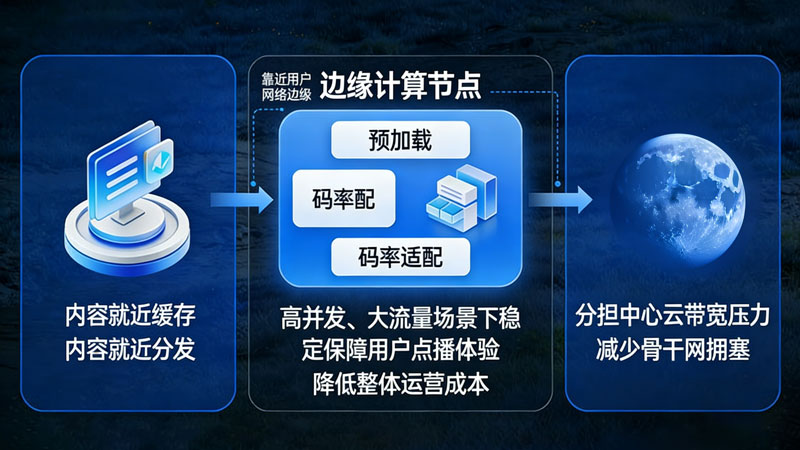 在视频点播场景中,边缘计算节点部署在靠近用户的网络边缘,实现内容就近缓存、就近分发,大幅降低传输延迟与卡顿,提升播放流畅度。同时分担中心云带宽压力,减少骨干网拥塞,并可在边缘完成预加载、码率适配等轻量处理,在高并发、大流量场景下稳定保障用户点播体验,降低整体运营成本。