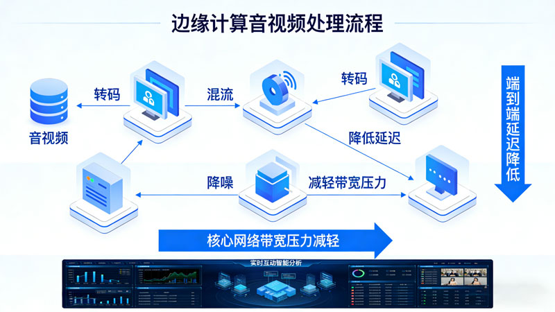 边缘计算节点在网络边缘,能够就近处理音视频数据,显著降低端到端延迟,减轻核心网络带宽压力。通过本地执行转码、混流、降噪等任务,提升通信质量与稳定性,同时支持实时互动场景下的智能分析,为用户带来流畅、低延时的体验。